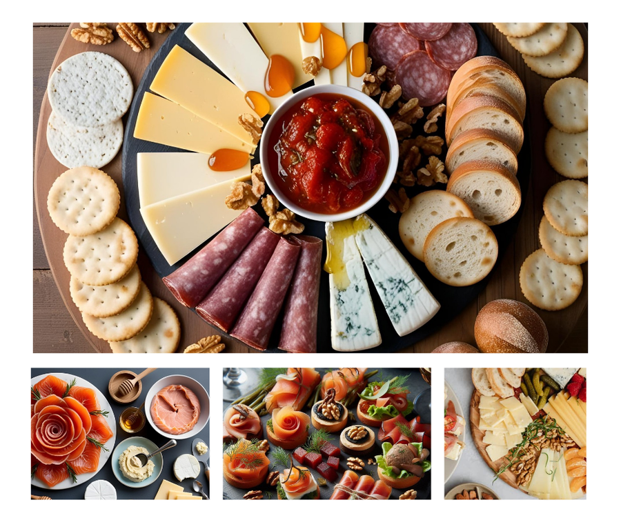 La tabla muy de moda  es la que combina salmón marinado o ahumado, tan versatil para crear una rosa o en forma de libro, foie con forma de bola de helado y pastrami, jamón o embutidos ibéricos. Adornada con sus distintos panes ( rebanadas de pan de pueblo), picos, pepinillos y al centro un cuenco de cebolla caramelizada (cebolla en juliana pochada con un poco de azucar).