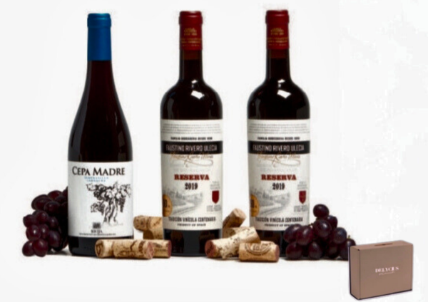 2 Vino Tinto Faustino Rivero Ulecia D.O. Utiel-Requena Reserva 75 c + 1 Vino Tinto Cepa Madre D.O. Rioja 75 cl 1 Caja Cartón Delycius 3 Botellas LOTE 34