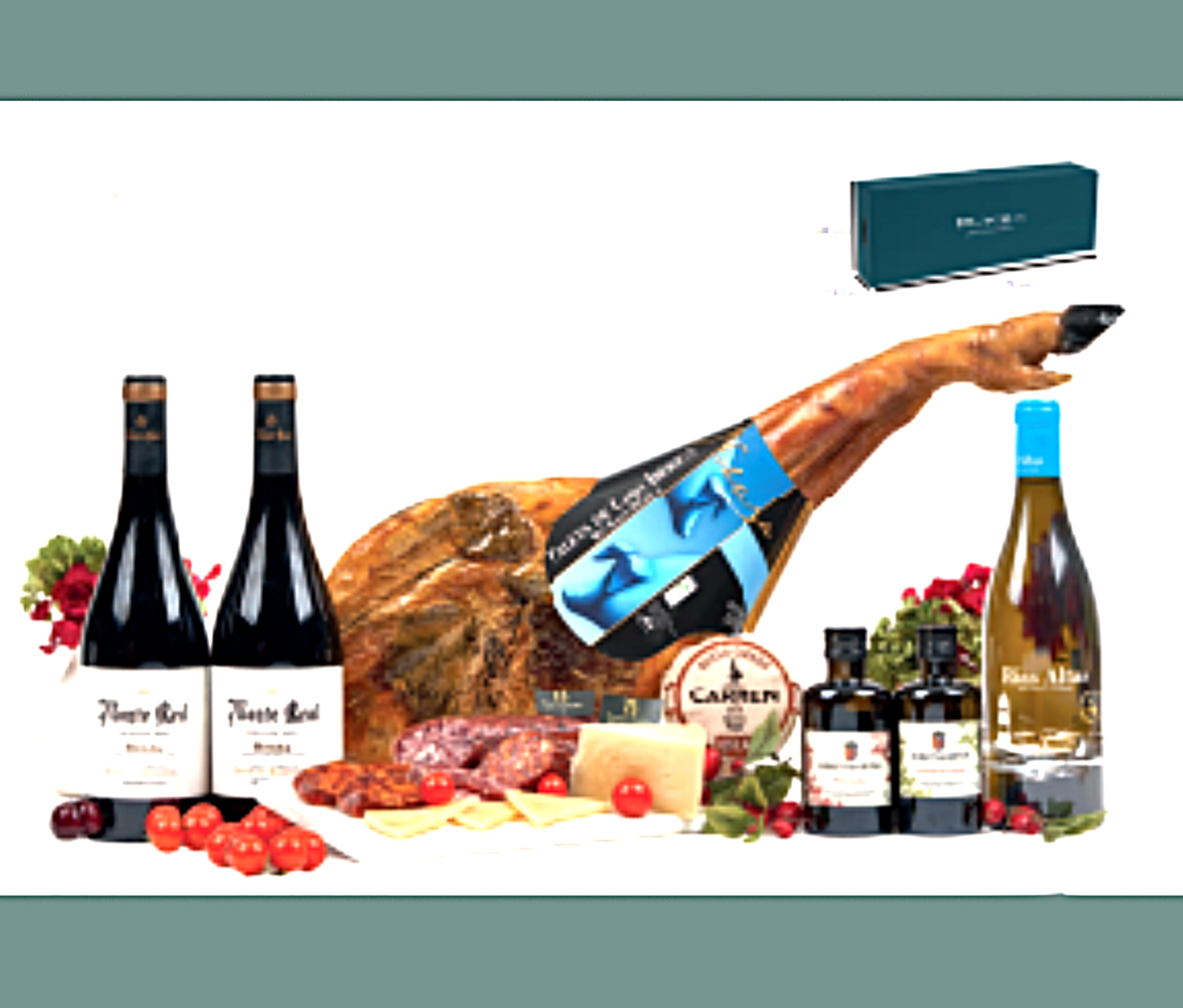 1Paleta de Cebo 50% Raza Ibérica Nobleza Castellana 4,5-5 kg1Chorizo de Bellota Ibérico Ibéricos Benito Vela 250 g1Salchichón de Bellota Ibérico Ibéricos Benito Vela 250 g1Queso de Oveja Curado Carmen Baby 400 g2Vino Tinto Monte Real D.O. Rioja Crianza 75 cl1Vino Blanco Gallego Rias Altas 75 cl1Aceite de Oliva Virgen Extra Picual Marqués de Griñón Dúo Collection 250 ml1Aceite de Oliva Virgen Extra Arbequina Marqués de Griñón Dúo Collection 250 ml1Caja Cartón Jamonera 79x28x12 cm