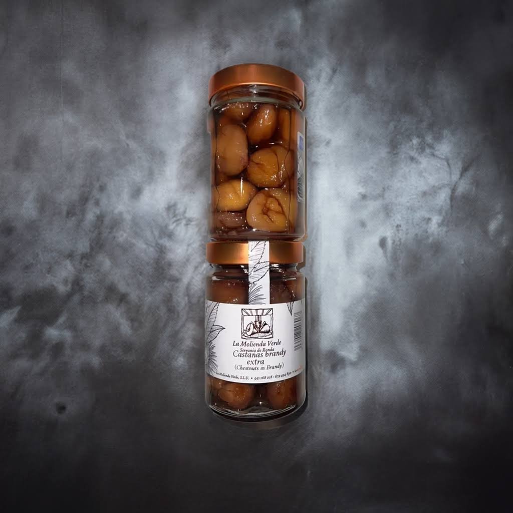 Castaña enteras seleccionadas cuidadosamente, confitadas en jarabe con canela y brandy bote de 300gr La Molienda Verde.