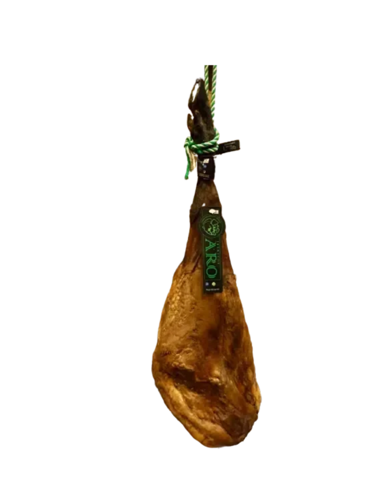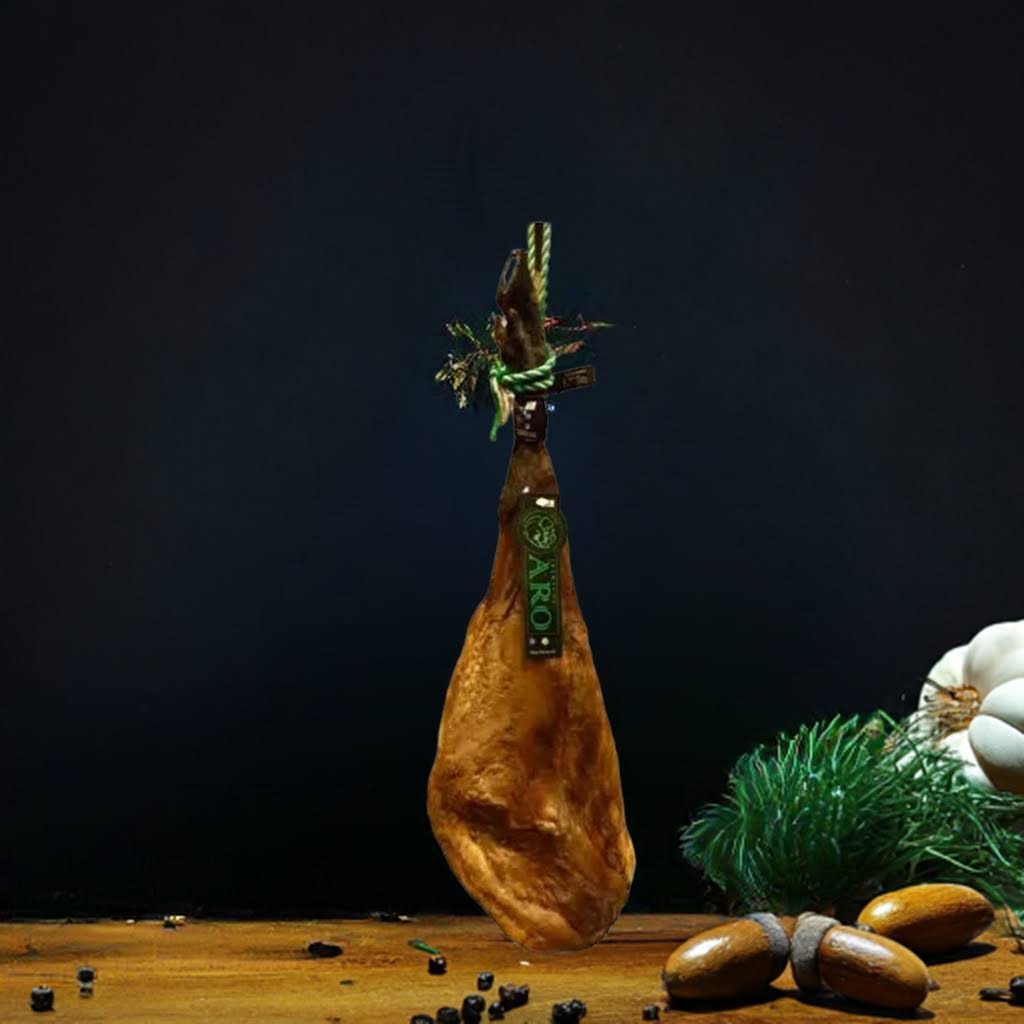 Jamón bellota 100% ibérico elaborado en cortes de la frontera por la empresa ibéricos aro, este jamón elaborado con tesón y la cultura de un gran maestro, para que su buqué tan peculiar llegue a nuestras mesas. Peso 6,5 a 7,5kg
