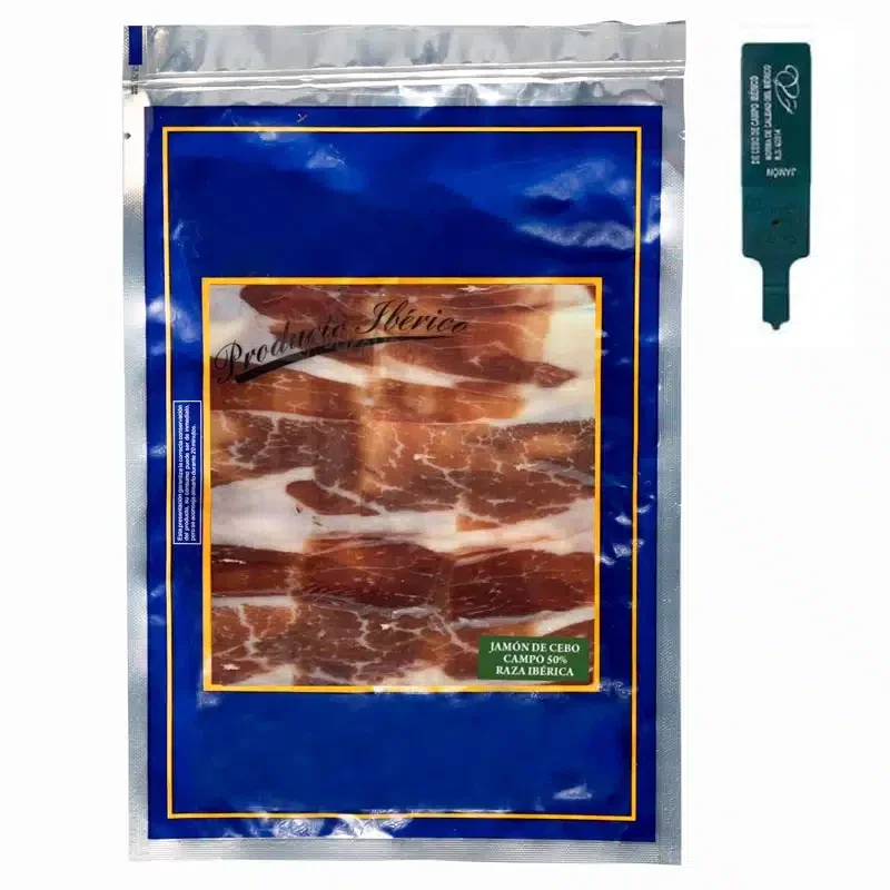 Jamón Cebo de campo 50% Ibérico Guijuelo loncheado a cuchillo por nosotros. Presentación de 100gr. y con una caducidad de 4 meses aproximadamente. No hace falta mantener en frío pues todo su aroma y sabor lo podemos deleitar a una temperatura entre 22º y 25º.