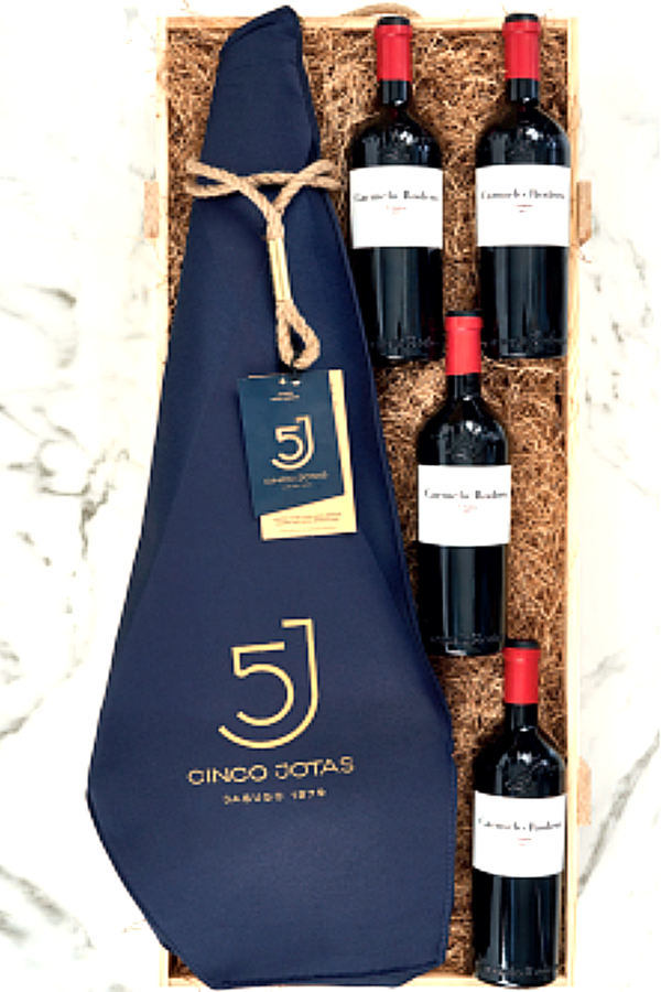 1Jamón de Bellota 100% Ibérico 5J 6,5-7 kg4Vino Tinto Carmelo Rodero D.O. Ribera del Duero Crianza 75 cl1Caja Madera Jamonera 100x36x15 cm
