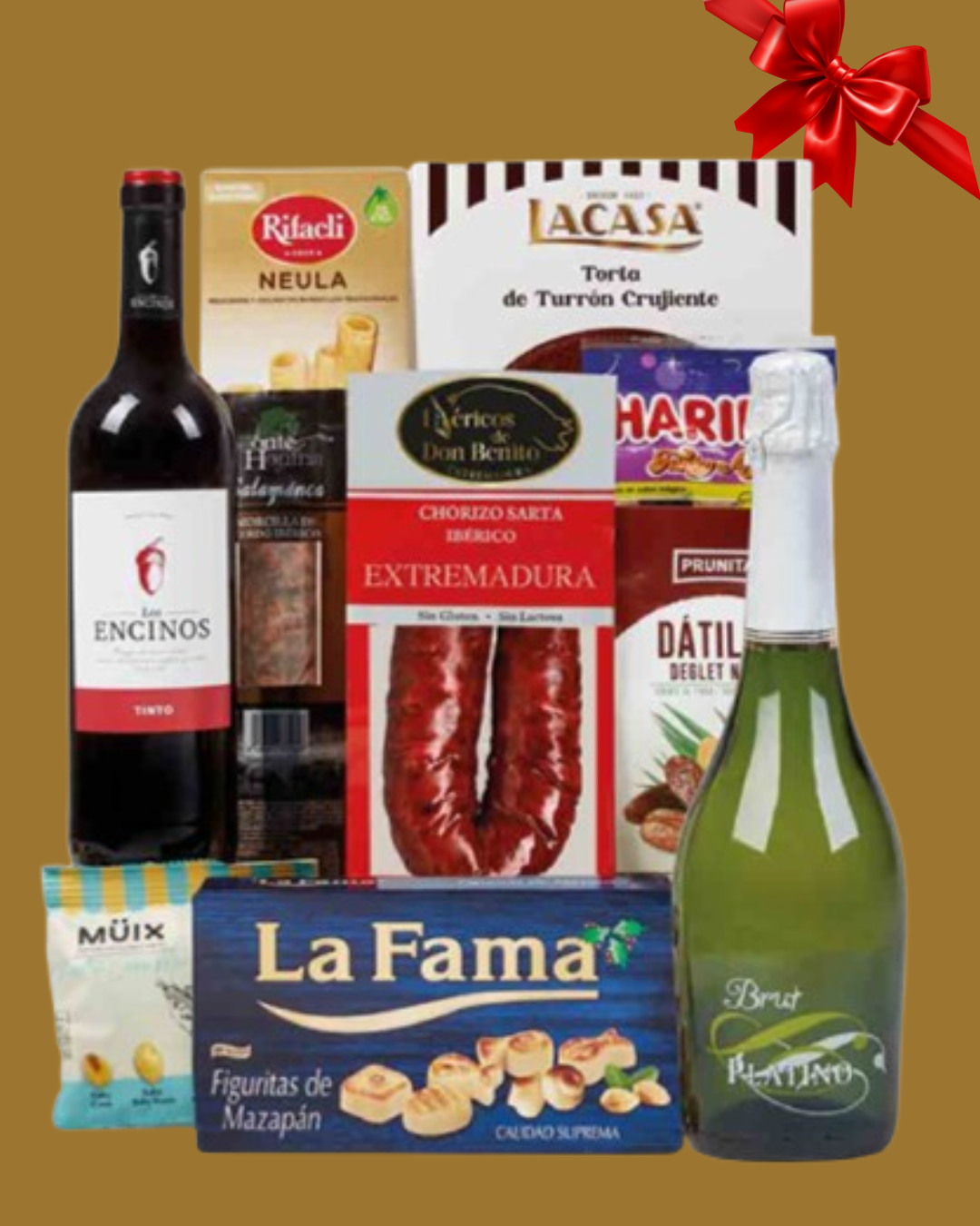 Chorizo y Morcilla Ibérica Montehonfría ,Vino Tinto Los Encinos 75 cl Espumoso Brut Platino 75 cl, Torta de Turrón de Chocolate Crujiente Lacasa, Datiles.