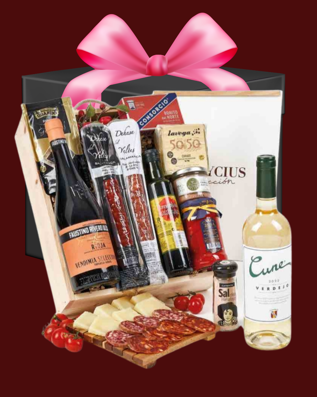 Lote Gourmet con vinos blanco y tinto, ibéricos, queso, Aceite de Oliva Virgen Extra, Sal Rosa Himalaya , Bonito del Norte,Paté Campagne con Boletus