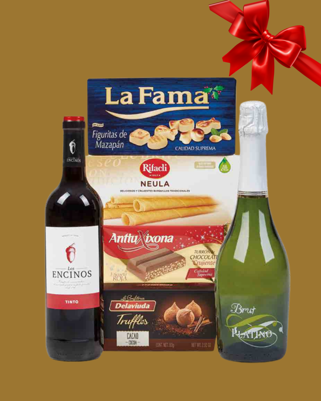 Vino Tinto , Espumoso Brut Platino Turrón de Chocolate Crujiente Antiu Xixona, Figuritas de Mazapán La Fama ,Trufas al Cacao Delaviuda Neulas Tradicionales