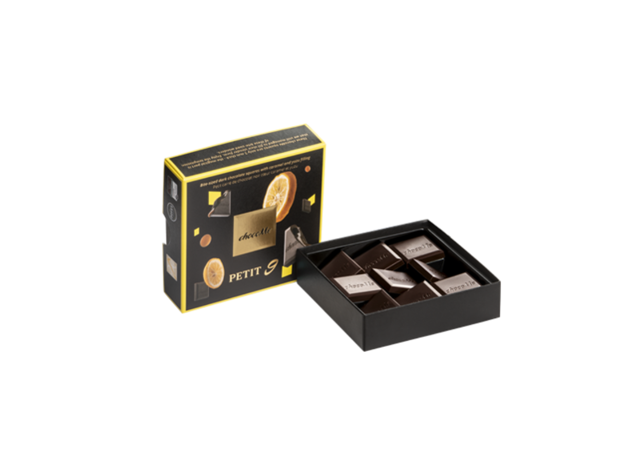 PETIT 9 CUADRADITOS DE CHOCOLATE NEGRO RELLENOS DE CARAMELO Y YUZU 50 gr