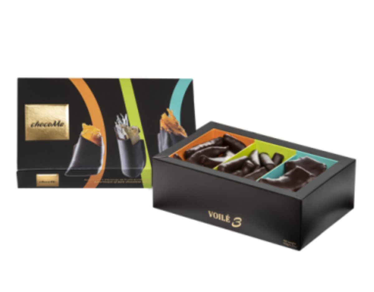 Todo lo mejor que Voilé puede ofrecer en una selección exclusiva: la Voilé 3. Los sabores de Voilé, premiados internacionalmente, son una compilación de cuatro especialidades de fruta con caracteres y sabores diferentes, recubiertas de chocolate. Cáscara de naranja española recubierta de chocolate negro y especiada con canela y clavo Jengibre confitado recubierto con chocolate negro Rebanadas de mango recubiertas de chocolate negro